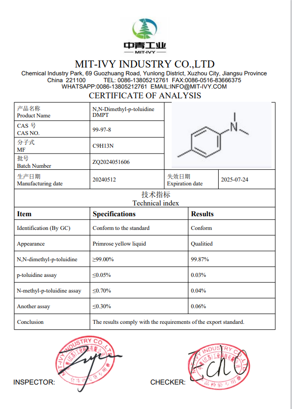 | Product:N,N-二甲基对甲苯胺- N,N-Dimethyl-p-toluidine | CAS:99-97-8 | Inspect Date:2024.07.07 | Production Date:2024.07.07 |