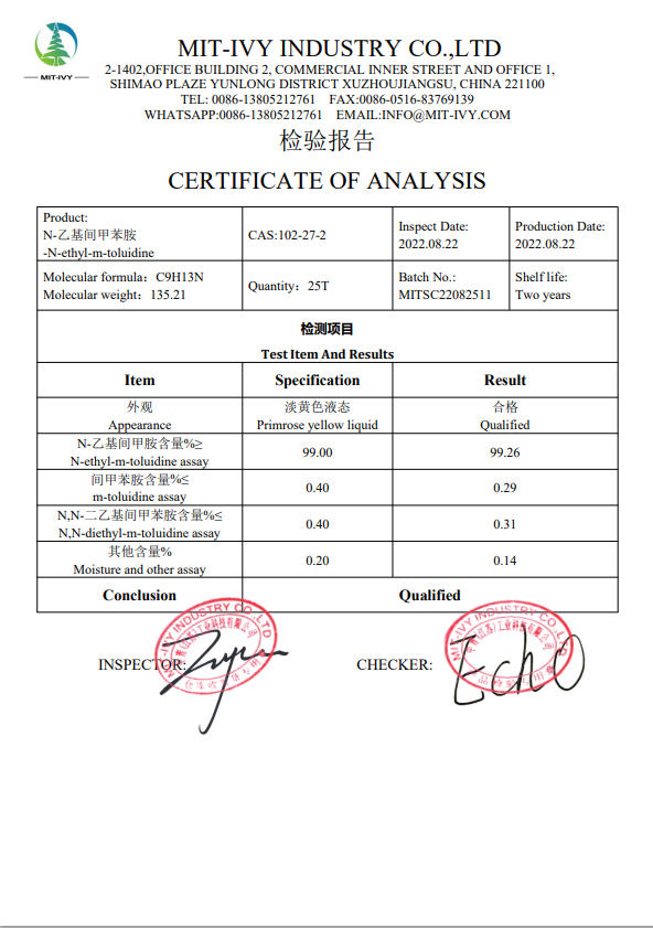| Product:N-乙基间甲苯胺-N-Ethyl-m-toluidine | CAS:102-27-2 | Inspect Date:2024.07.07 | Production Date:2024.07.07 |