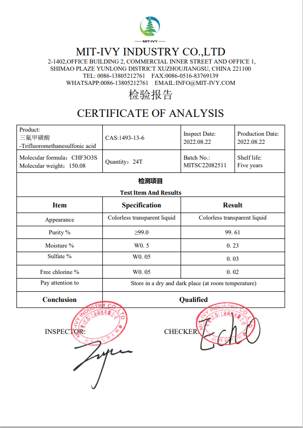 It is used for organic synthesis, widely used in pharmaceutical and chemical industries, such as nucleosides, antibiotics, steroids, protein, sugar, vitamins synthesis, silicone rubber modification. Isomerization and alkylation of the catalyst, the preparation of 2, 3-dihydro-2-indanone, tetralone, glycosides in the removal of glycoproteins. As a catalyst in Friedel-Crafts type acylation, alkylation and polymerization reactions; as a solvent for ESR; as a nonaqueous strong acid titrant; with trifluoroacetic acid, q.v., in solid-phase peptide synthesis. One of the strongest available monoprotic acids. Trifluoromethanesulfonic acid acts as a catalyst for esterification reactions and an acidic titrant in nonaqueous acid-base titration. It is useful in protonations due to the presence of conjugate base triflate is non nucleophilic. It serves as a deglycosylation agent for glycoproteins. In addition, it is a precursor and a catalyst in organic chemistry. It reacts with acyl halides to prepare mixed triflate anhydrides, which are strong acylating agents used in Friedel-Crafts reactions. It acts as a key starting material for the preparation of ethers and olefins by reacting with alcohols as well as to prepare trifluoromethanesulfonic anhydride by dehydration reaction.