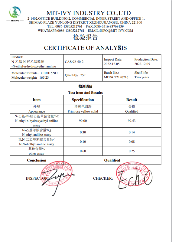 | Product:N-乙基-N-羟乙基苯胺- N-Ethyl-N-hydroxyethylaniline | CAS:92-50-2 | Inspect Date:2024.07.07 | Production Date:2024.07.07 |
