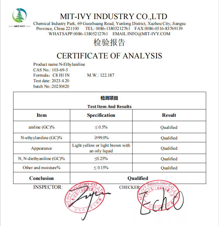 | Product:N-乙基苯胺-N-Ethylaniline | CAS:103-69-5 | Inspect Date:2022.09.02 | Production Date:2022.09.02 |