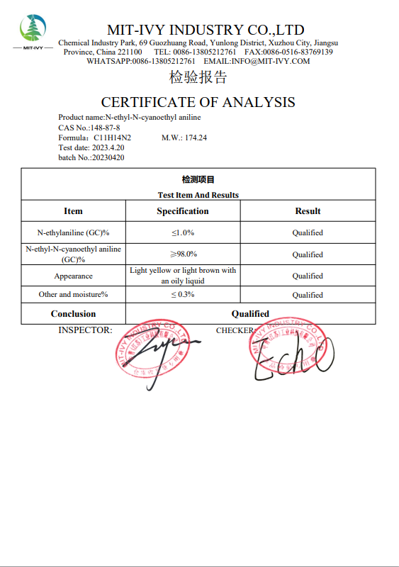 | Product:N-乙基-N-氰乙基苯胺- 3-Ethylanilinopropiononitrile | CAS:148-87-8 | Inspect Date:2024.07.07 | Production Date:2024.07.07 |