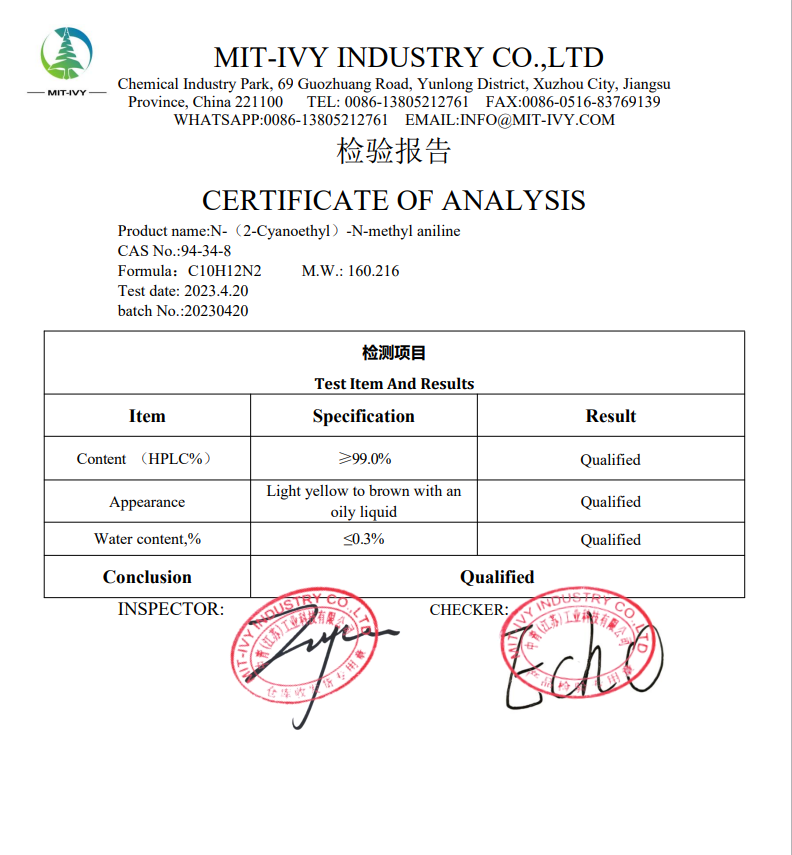Product:N-甲基-N-氰乙基苯胺- N-Cyanoethyl-N-methylaniline CAS:94-34-8 Inspect Date:2024.07.07 Production Date:2024.07.07