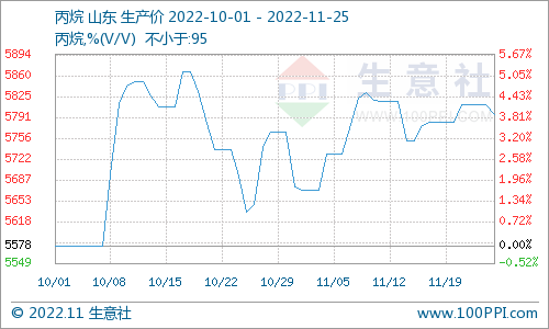 In November, China's domestic propane market fluctuated and rose, and the Shandong propane market struggled to rise. According to SunSirs data monitoring, the average price of propane in Shandong was 5,670 yuan/ton on November 1, and 5,795 yuan/ton on November 25, an increase of 2.19% within the month and a decrease of 3.594% compared with the same period last year.